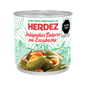 The whole chili jalapeno pods from Herdez en Escabeche, a spicy blend with pickled carrots, among other ingredients. The Jalapeño is a characteristic and popular Mexican ingredient. The jalapeño is now known all over the world. It comes from Veracruz in Mexico and is perfect as a spicy topping for nachos, pizza, tortillas, etc.