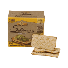 Sanissimo Salmas are the tostaditas made with a simple recipe of three ingredients. The smaller version of the tostada. They are baked in the oven for a crispy texture and just the right amount of flavor. They are gluten-free and contain no artificial preservatives or added sugars, so you can snack with a clear conscience. Because they are baked rather than fried, they contain much less fat than other tostadas.