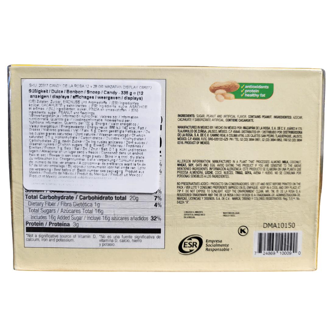Descubre el delicioso placer del Mazapán de La Rosa - una sola pieza de 28g. El Mazapán es un dulce tradicional mexicano que te encantará por su sabor único y su delicada textura. Elaborado con ingredientes de alta calidad, ofrece una irresistible combinación de cacahuetes finamente molidos, azúcar y un toque de vainilla.