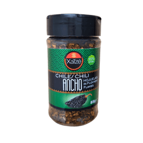 Getrocknete Ancho Chili Flocken von Xatzé 85g. Die getrocknete Form der Poblano-Chili ist eine der am häufigsten verwendeten getrockneten Chilis in Mexiko. Die Chilischote ist dunkelrot gefärbt und zwischen 12 und 15 Zentimetern lang. Obwohl sie der Chilischote Mulato sehr ähnlich ist, hat sie einen Geschmack mit anderen Nuancen. Der Schärfegrad ist sehr unterschiedlich und reicht von ziemlich stark bis leicht scharf.